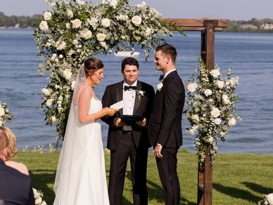 Custom wooden arbor is a great ceremony piece. Be sure to ask about floral and drapery accents to complete your ceremony vision.