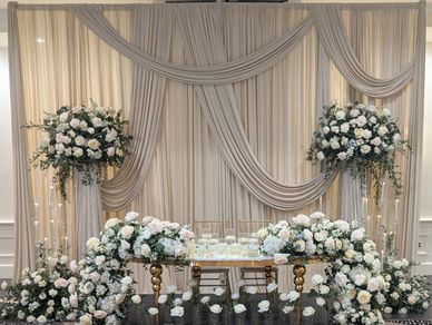 Our custom wedding backdrop installations are designed to create unforgettable focal points for your ceremony and reception. Using layered textiles, curated florals, and sophisticated lighting, we craft immersive designs that frame your most important moments beautifully.