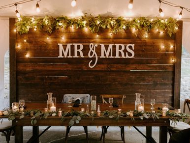 12ft x 8ft wooden wall perfect for photo op or behind head table. Mr. & Mrs. letting removable for optional custom signage. Add greenery or floral accents to highlight this show stopper!